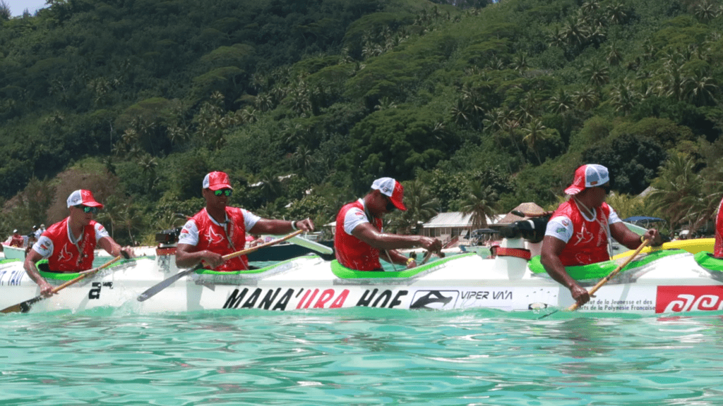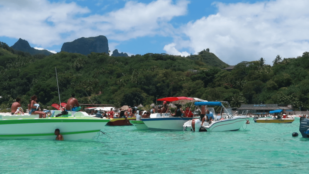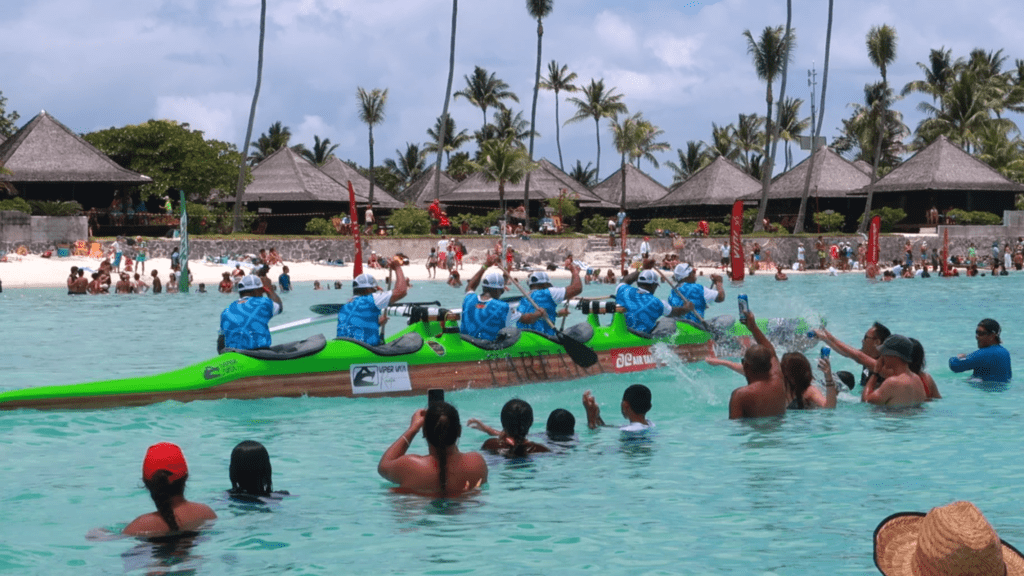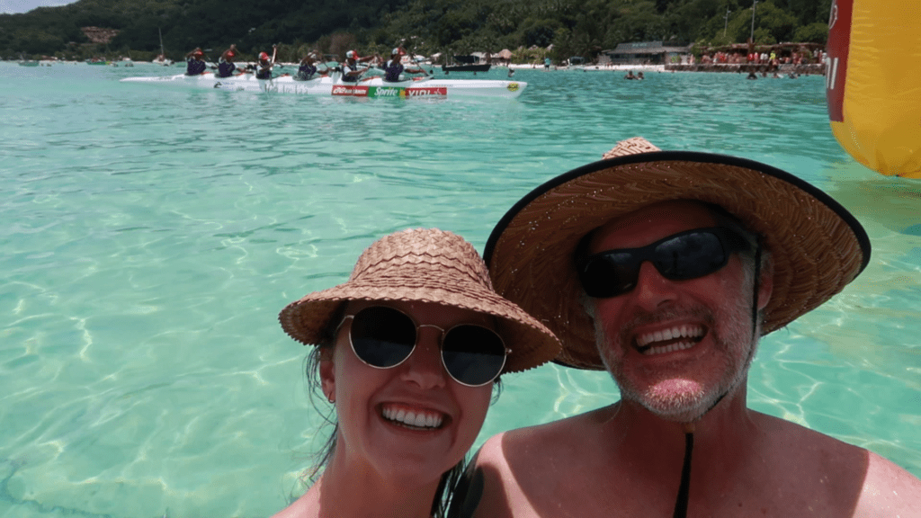 The lagoon quickly became a washing machine of wakes. These skilled athletes seemed to alter their course to use it to their advantage, surfing where they could to increase their speed. People were cheering, music was playing, and coaches were yelling over loudspeakers. It was a chorus of chaos! We followed as the locals led the way to the finish line at Matira Beach. We walked our dinghy through the crowd in waist-deep water to witness the action.