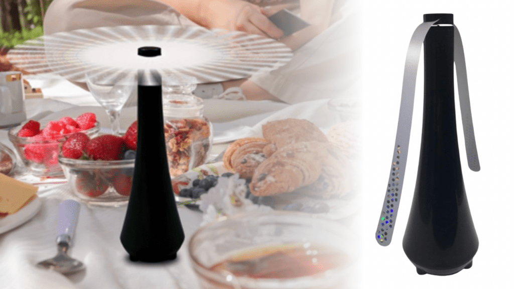 Battery-operated tabletop fan to keep flies off your food. We received this as a gift years ago and use it all the time for cockpit dinner parties or post-swim chips + dip.