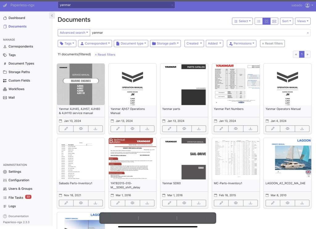 Paperless: We upload all of our documents to this application, including manuals, reference material, receipts, etc. The software does optical character recognition on the files, and then everything is searchable. It’s very helpful when I need to know the torque value for the bolts on the Flexofold props, for example. This allows us to eliminate storing paper on the boat.
