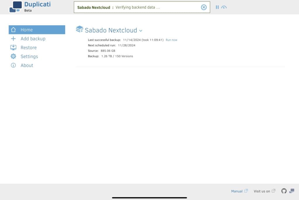 Duplicati: The risk with self-hosting all this data on our own server is that something will fail, and we will lose it all. To protect against that, we run backup software called Duplicati. Duplicati compresses and encrypts all of our data and uploads it to cloud storage. One of our friends then syncs that data to his home server, so it’s stored in multiple locations.
