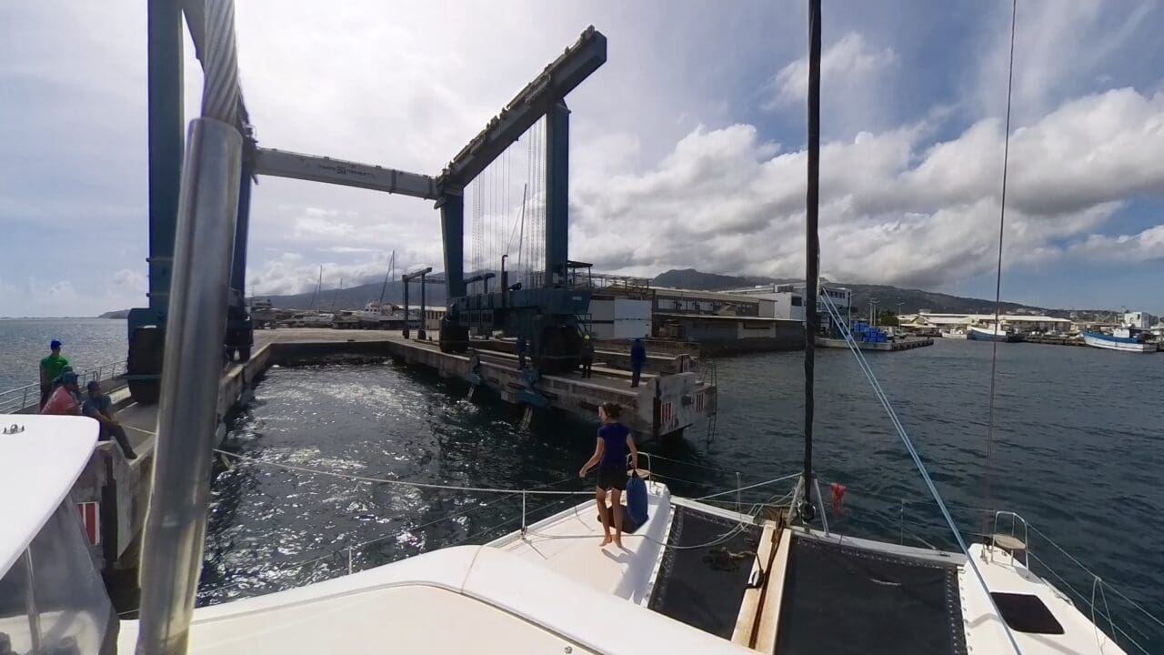 The following day was our haul out. I was cutting it close with that trip! We chugged our coffee and readied our lines and fenders. The wind began to pick up as we motored toward the boatyard. It was blowing 20kn by the time we got to the well. The yard hailed us on the radio, instructing us to bring our bow and stern lines midship, approach the well sideways, throw both lines simultaneously, and then pivot in. We’ve never done anything like this; honestly, it sounded crazy. We put our headsets on and assumed positions: me on the bow, ready to handle the fenders and lines, and Ray at the helm. We attempted an approach but bailed out soon after, circling around to try again. We had not gotten close enough to the concrete pier to throw the lines, but we had gotten a better idea of how things would go. Our second attempt was not much better, but with the yard guys’ encouragement, I threw the bow line. We were still too far away; the line missed the pier by a few feet and plunged into the water. I quickly pulled it back aboard as Ray announced he was reversing so I could try again. He got the boat into position, and I tossed both lines together on our port side- both were caught. Phew! Third time’s a charm! Now, the real challenge began: pivoting into the well with the wind on our beam. Seven men handled our port bow and stern lines as I moved around the boat with a fender in hand, talking to Ray through my headset.