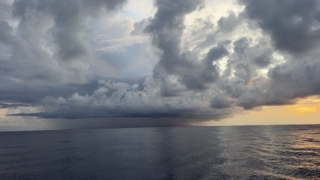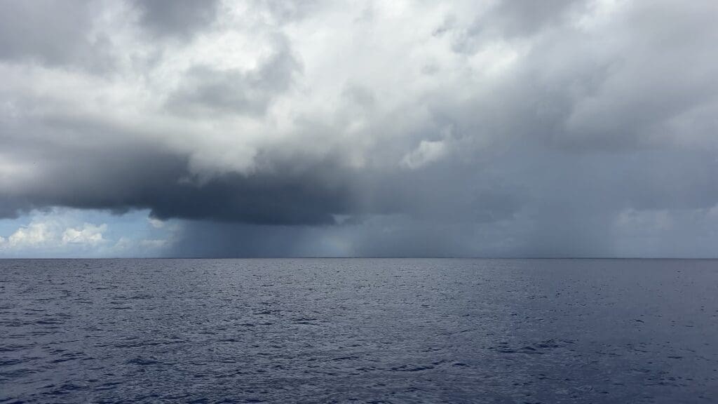 On Wednesday, the updated weather forecast showed high winds and lightning in the Tuamotus. We’d been watching the weather patterns throughout French Polynesia for a while now, and it seems like any time the Tuamotus or Society Islands get hammered, it’s been pretty pleasant in the Marquesas. So, we decided to alter course to Tahuata, powering through instead of stopping in Tuamotus, more than doubling the length of this passage. We’re desperate for a break from this weather. The jump from the Tuamotus to the Marquesas is notoriously rough, beating into the wind and waves. Conditions started picking up Wednesday night, and we spent all day Thursday dodging squalls, sailing periodically but predominantly motoring to maintain enough speed to stay ahead of the trailing lightning storms.