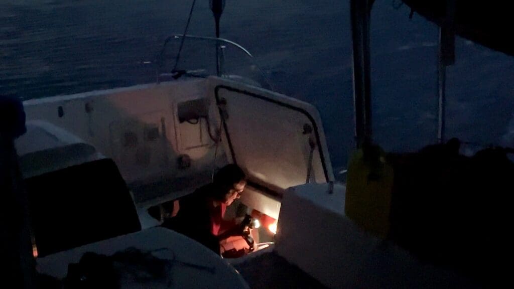 We both sighed in relief when we saw no water in the oil, but what was causing the noise then? We bounced ideas around: maybe it’s the alternator, so let’s turn off charging and see if it stops. Nope. Do we hear it at different RPMs? What if we turn off that engine and now stick your head in the other engine compartment… this went on for an hour or so before we settled on the idea of a singing prop: a high-pitched noise similar to a ringing wine glass caused by fluid circulation and vortex shedding. If you’d like to nerd out on this topic, I found this brief technical report very interesting! We closed the engine compartment and continued motoring through the night. The sound eventually faded away.