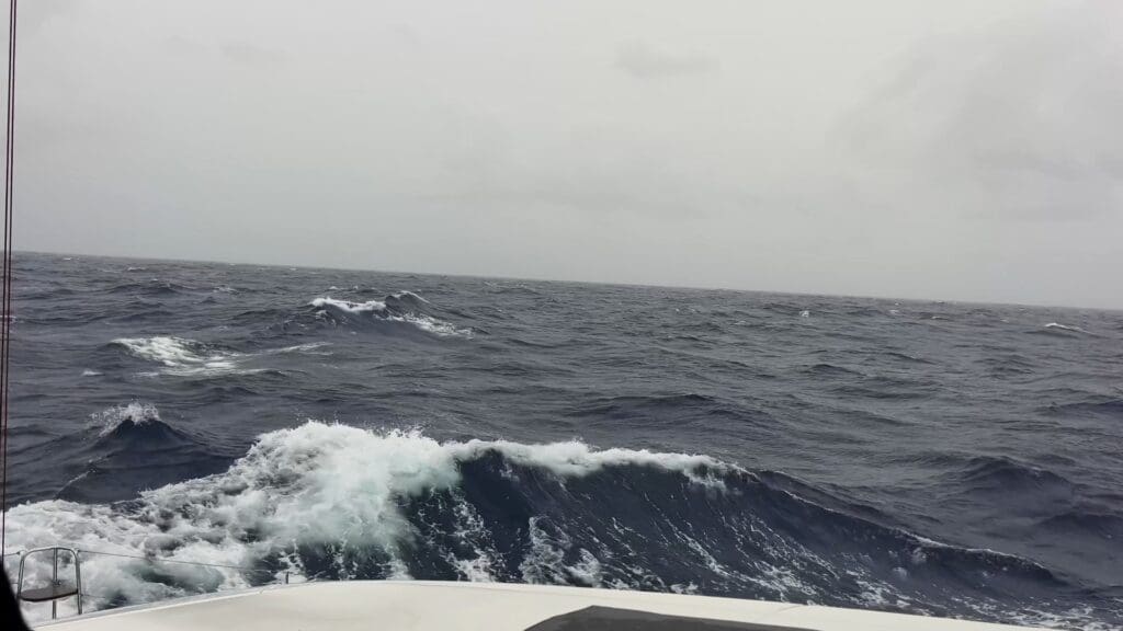 Ray called me inside and asked if I had spilled my water bottle down the stairs. “No, why?” I asked. My eyes widened as he pointed to a puddle at the bottom of the steps down into our hull. I immediately assumed our escape hatch was leaking. I tasted the puddle; it was salt water, but the escape hatch was dry. We traced the droplets up to the ledge below the saloon window. We had taken a massive wave over the side of the boat… was our window leaking? We couldn’t see any part that looked compromised, and it was far above the waterline, so we decided to sop up the puddle and investigate later when we were on anchor. At this point, we were just in survival mode.