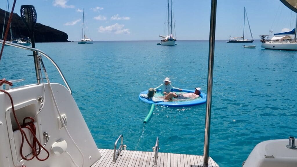 My parents arrived Friday morning to an exceptionally rolly anchorage. Most of the anchorages in the Marquesas are rolly, but their first night aboard was (of course) the worst we’ve had- take a Dramamine level of rolly. We left the next morning, making a quick 2-hour sail to Tahuata. Thankfully, the most popular anchorage was nearly empty! We got a sweet spot near the picturesque beach, inflated our SunChill, and jumped in the bright blue water.