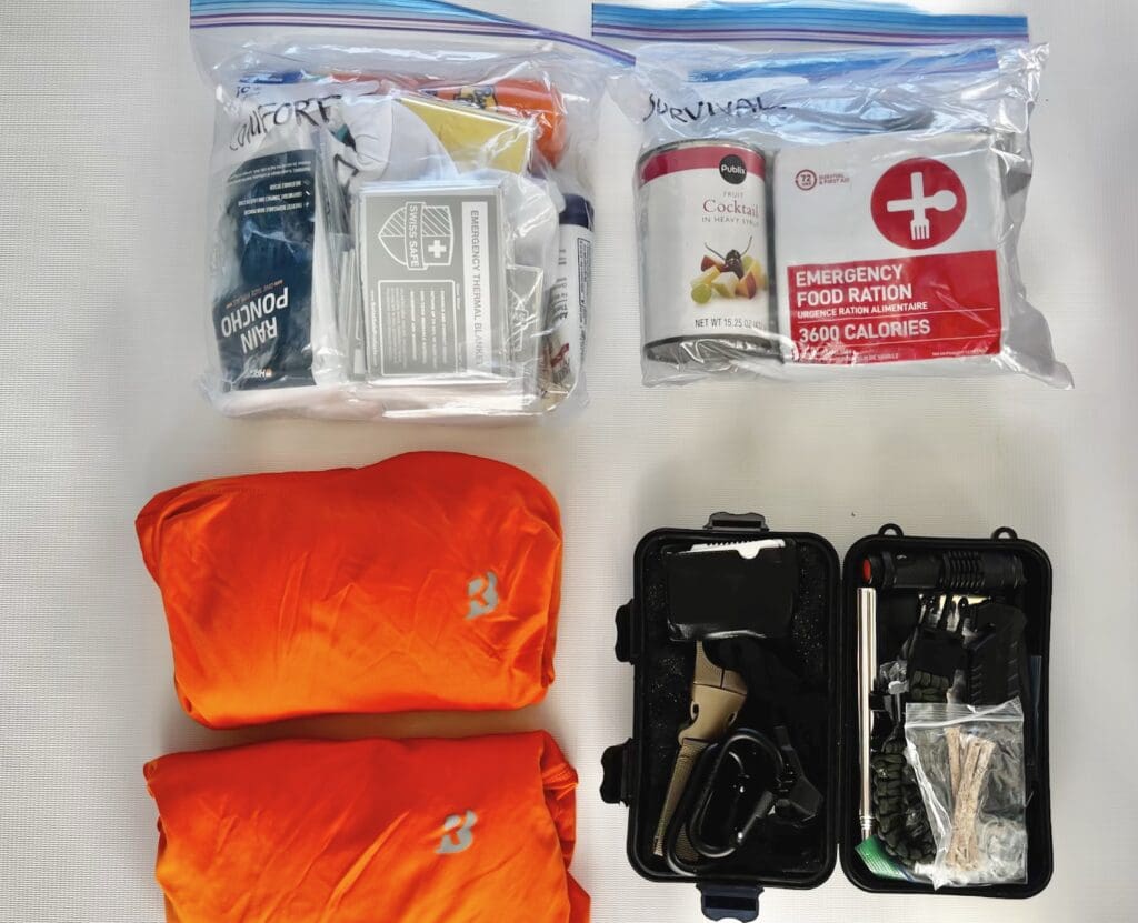 - Survival kit: Ours includes fishing gear, emergency blankets, a knife, fire starter, whistle, wire saw, and several multitools.