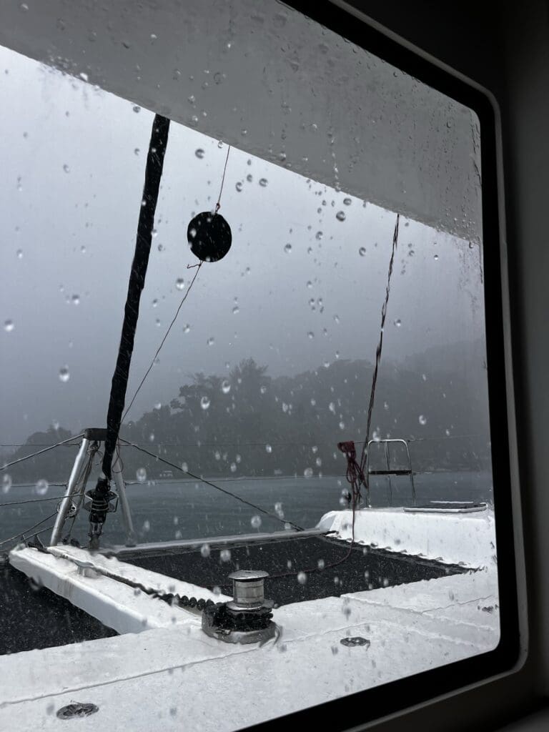 Suddenly, the anchorage was enveloped by clouds—so much for a good solar day! It rained on and off for the rest of the afternoon. Although the morning sunshine had fooled us, by 3pm we knew we’d need to run the generator. This was our fourth day of cloud coverage, and our batteries were not happy.