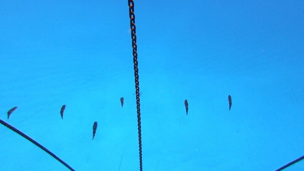 Afterward, I shimmied into my wetsuit for a dip in the irresistibly blue bay. It’s winter here; we’ve been sleeping under blankets and pulling out our jackets most days, but I couldn’t pass up the opportunity to swim! I was greeted by a group of skittish squid hanging out by our anchor chain.