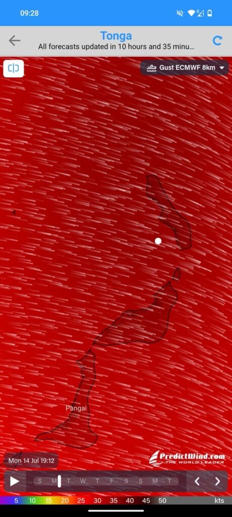 We pulled our anchor just before sunrise the following morning, hoisting our sails and shutting off the engines in the moonlight. We were sailing great: a beam reach right toward our destination. Unfortunately, about three hours in, Ray made the call to turn around. He had checked the latest weather update, which called for 30kn/gusts to 40kn of wind from the west at our destination (which has zero protection from the west), and potential lightning. Our weather router said the best place in Pangai in those conditions would be to tie stern-to against the sea wall. We’d rather avoid it altogether!