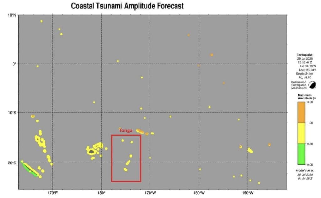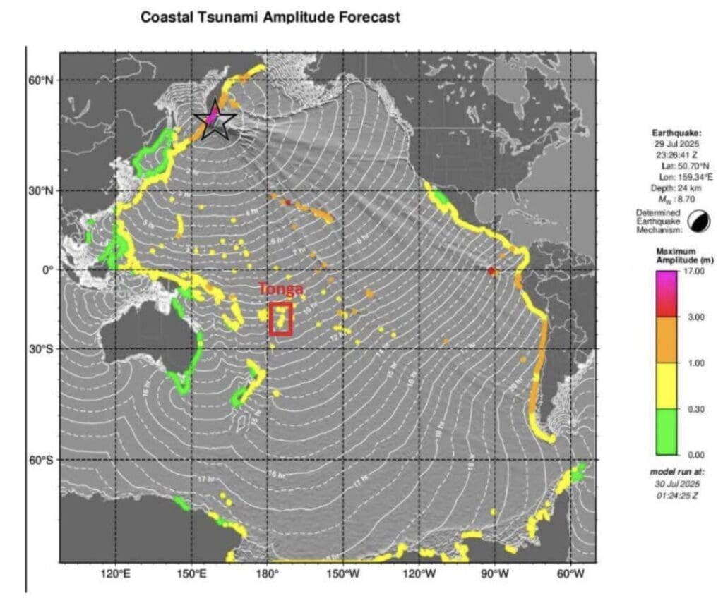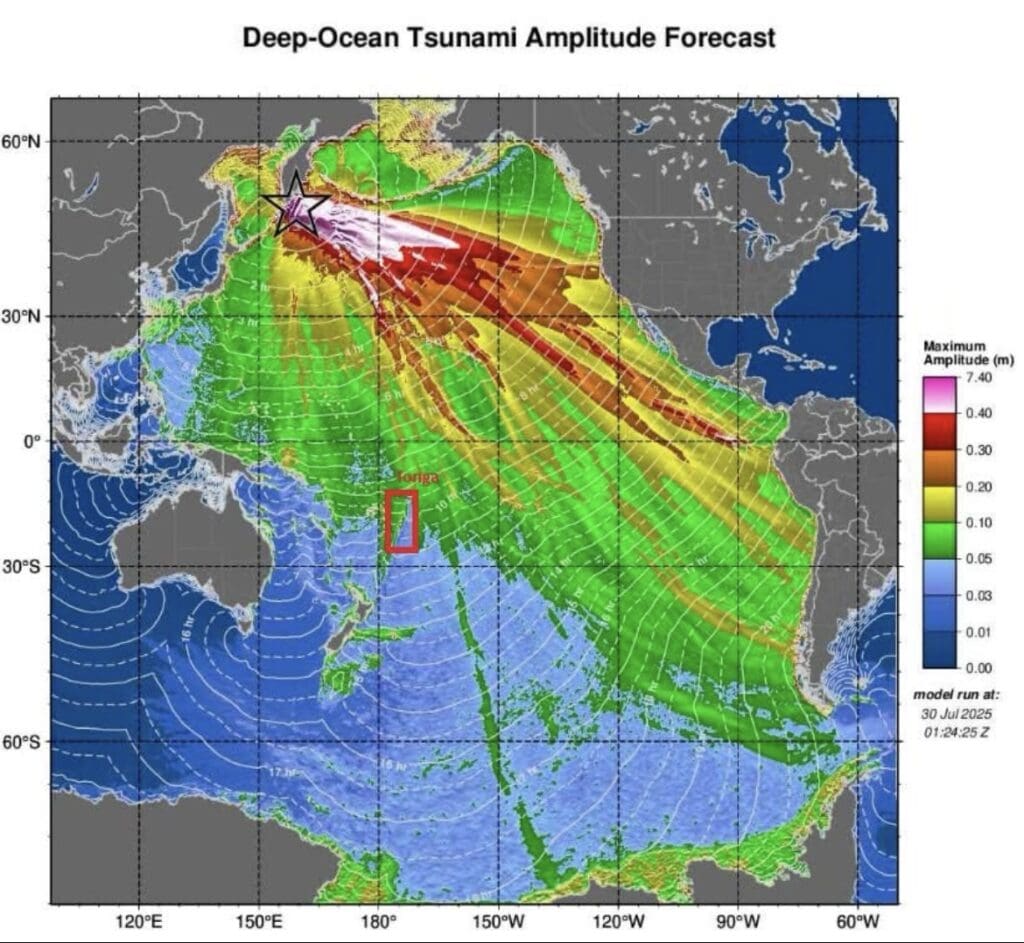 JULY 30, 2025 8PM: Sirens began sounding on shore as Tonga was upgraded from a “Tsunami Alert” to a “Tsunami Warning.” At that point, all amplitude forecasts predicted the wave to be 1 meter or less.