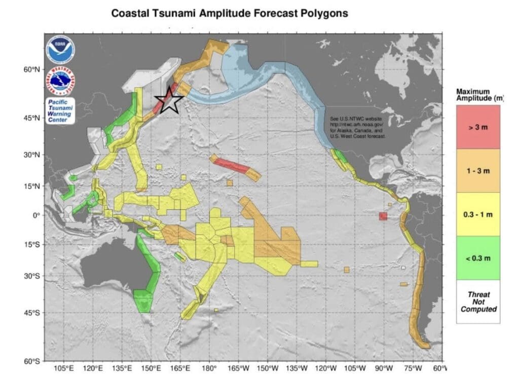 - Tsunami Advisory/Alert: A potential tsunami may produce strong currents or dangerous waves, especially in harbors and coastal areas. Threat level = Low to moderate. Flooding is not expected, but marine and beach conditions can be dangerous.