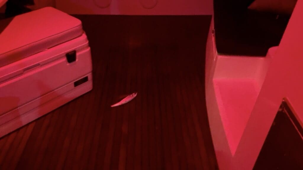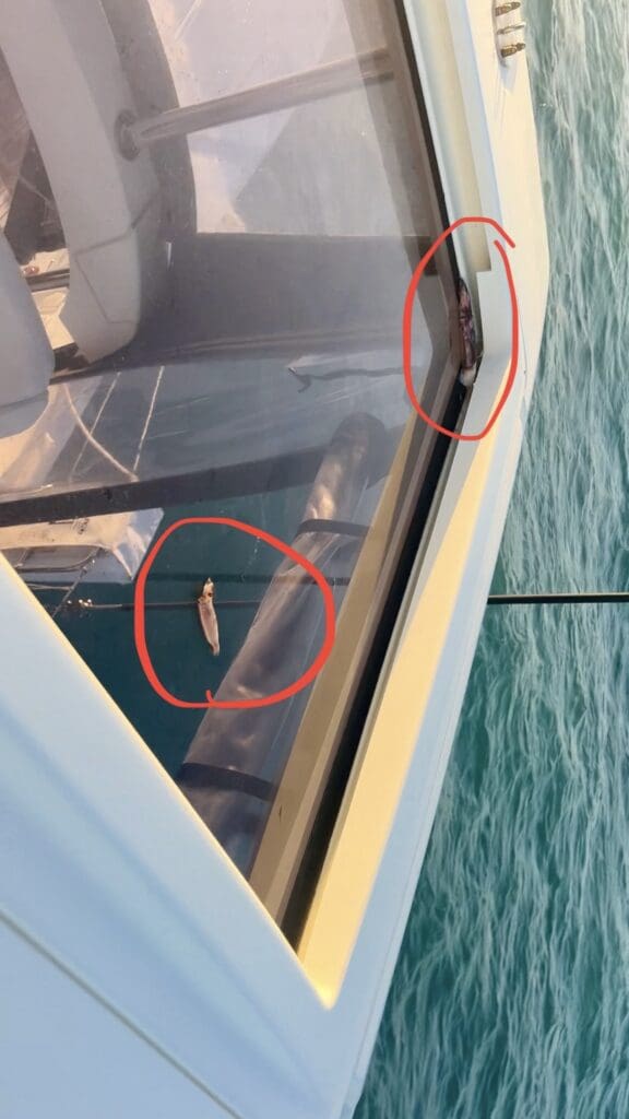 Given the information we had at the time and the topography of our anchorage, we were satisfied with our decision despite how uncomfortable we were in the wind and waves. We turned the engines off and drifted, periodically firing them back up to redirect when we began moving toward a reef. Waves crashed into our cockpit and across our deck, sending flying fish to our doorstep and catching squid on our roof. These conditions were weather-related, not tsunami-related.
