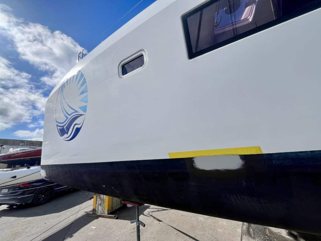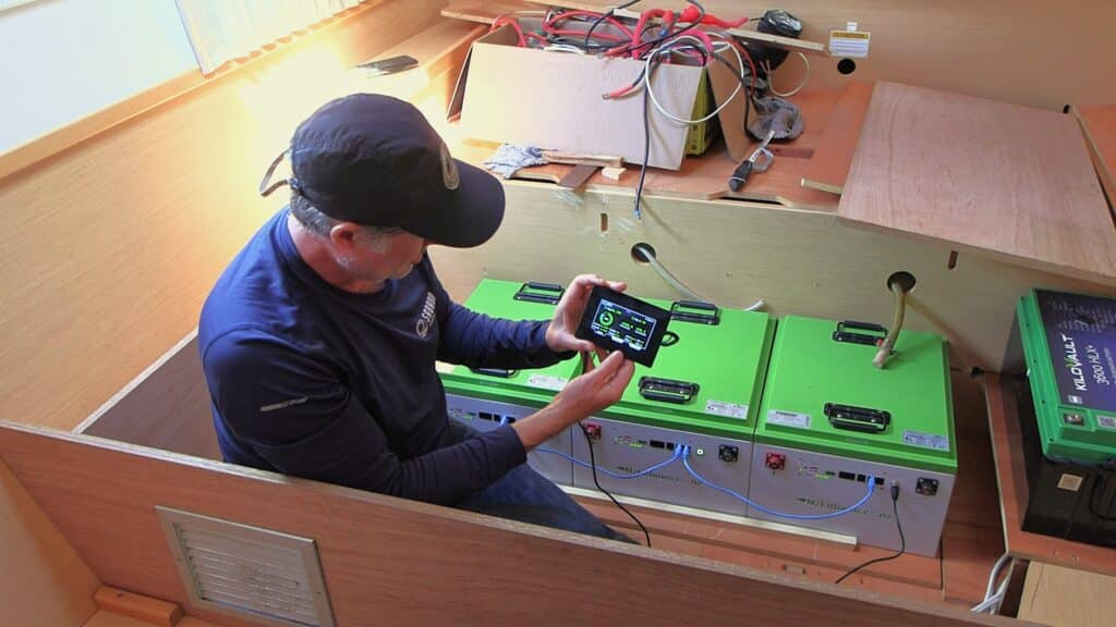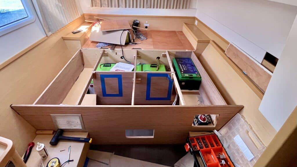 Three 24V 345Ah LiFePO₄ batteries from NZ Lithium arrived at the yard this week. Thanks to a forklift and our friend Nestor from a neighboring boat, we were able to get them safely onto Sabado and into the bed base Ray is building for our new electrical system. Ray added a few cutouts for vents and continued framing the rest of the space this week. At this point, we’re just waiting for the Quattro and the new air conditioner to arrive.