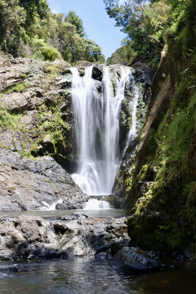 The Piroa Falls Track is a short but rewarding hike that ends at a beautiful waterfall, complete with clean, deep pools perfect for swimming. There’s also a picnic table, so we packed a cooler and enjoyed lunch in the forest.